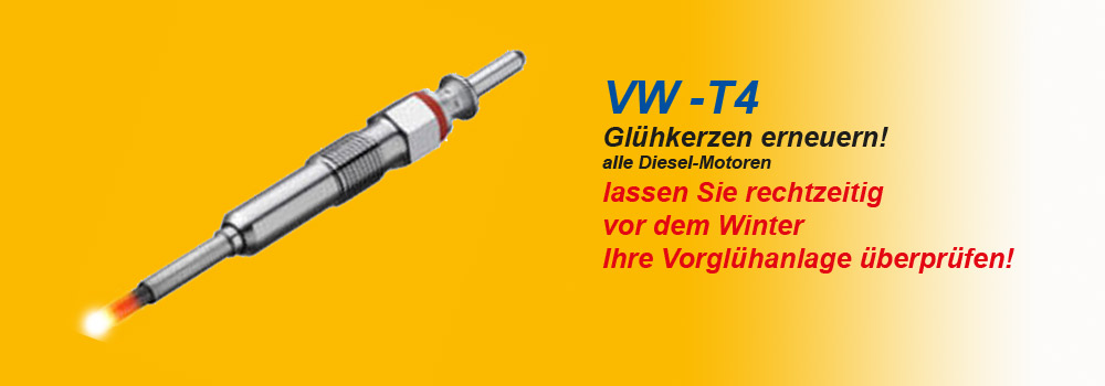 Der Dieselmotor muss zum Starten seine Brennräume mittels Glühkerzen vorheizen. Fallen Glühkerzen aus, springt das Fahrzeug - gerade in der kalten Jahreszeit- schlecht oder gar nicht an. Da der T4 bei einem Glühkerzenwechsel in Service-Stellung gebracht werden muss, empfiehlt es sich alle Glühkerzen zu erneuern.